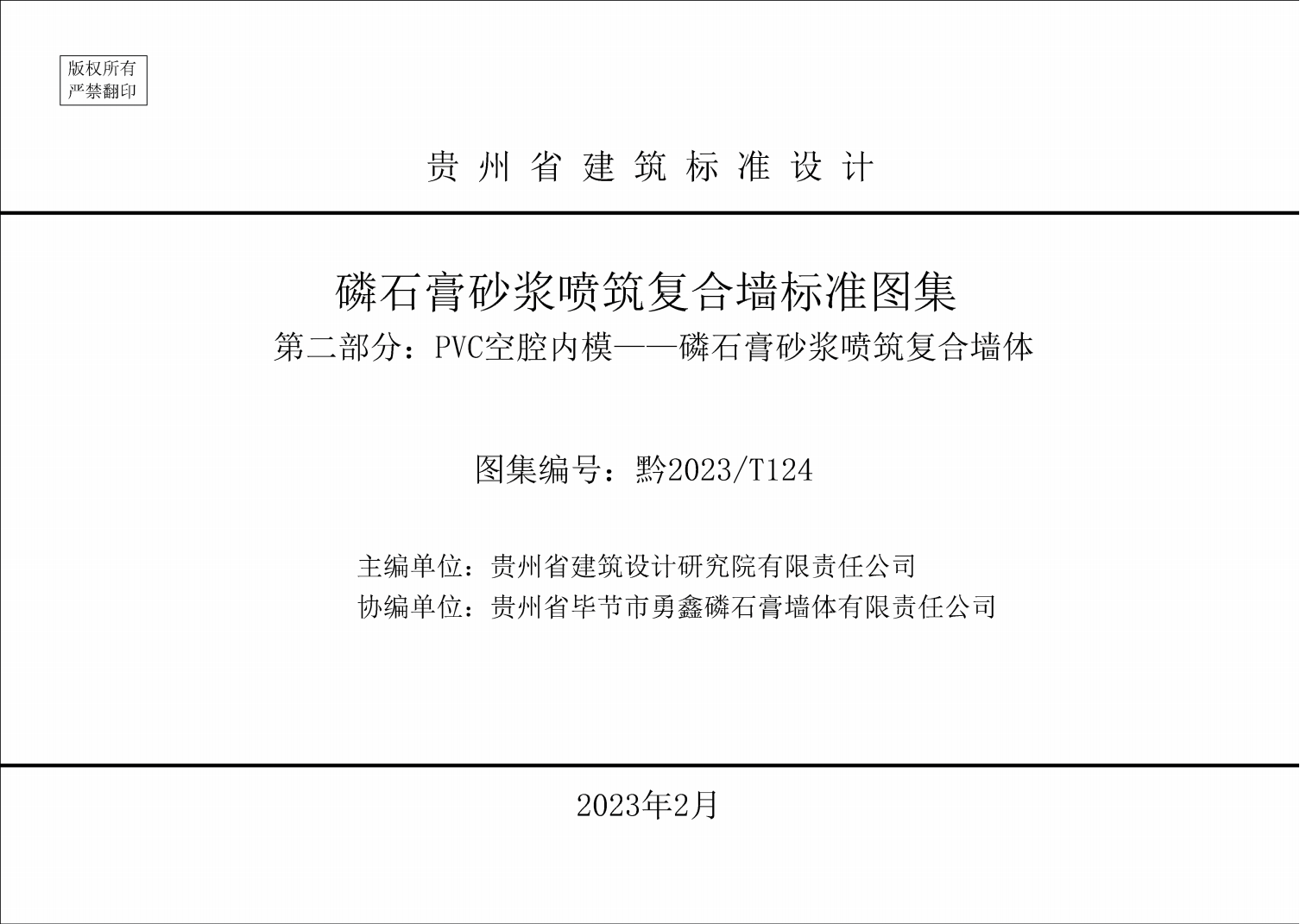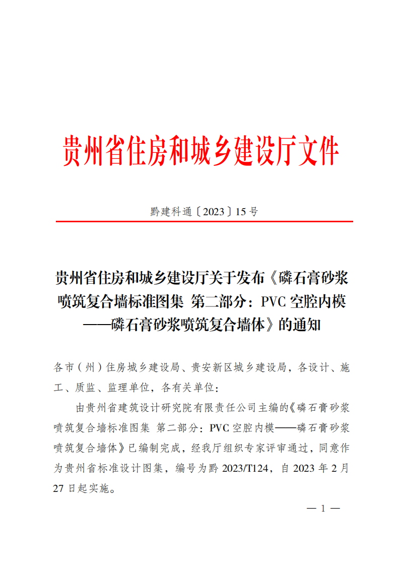 贵州省住房和城乡建设厅关于发布《磷石膏砂浆 喷筑复合墙标准图集 第二部分:PVC 空腔内模 ——磷石膏砂浆喷筑复合墙体》的通知