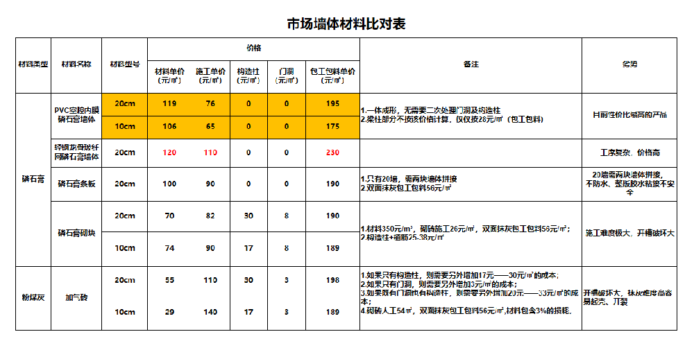 市场墙体材料比对表